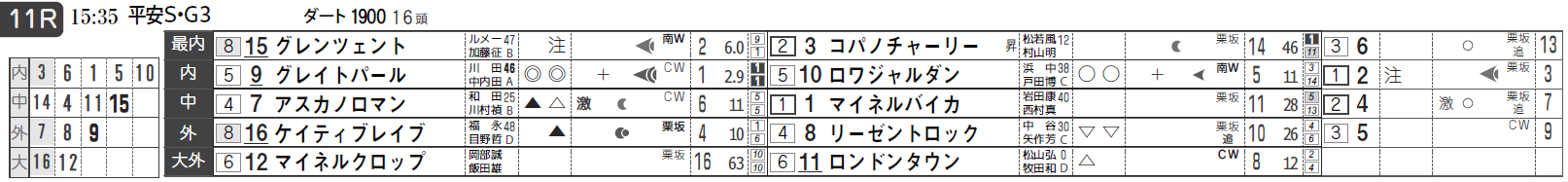 1番手の4歳馬2頭、15・グレンツェント、16・ケイティブレイブは3連複フォーメーションの3列目にでも。