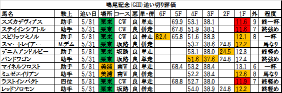 …今週のCWはかなり速いラップを出している馬も多かったが、この馬はそんなにチップで出してくる馬ではない、という中で最後まで良い走りを見せた。特に前肢の伸びが目立ったのは好感。