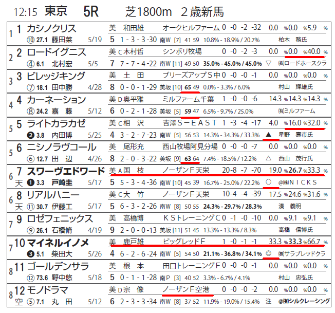 新馬戦の成績が太文字の2・ロードイグニスの木村厩舎、8・リアルハニー大竹厩舎は好走はほぼ「天栄」オンリー。