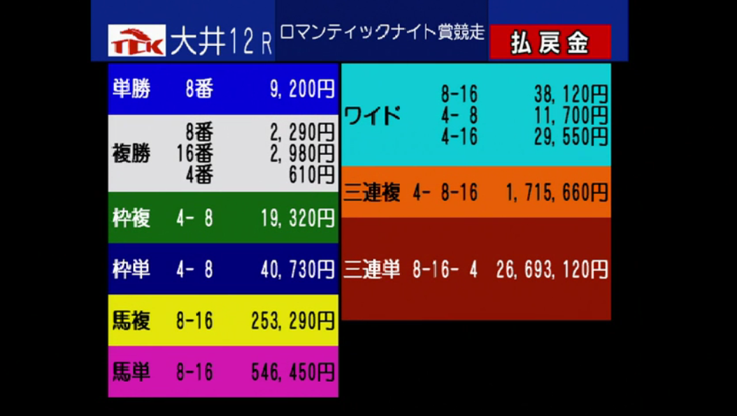 27日、大井競馬場第12レース・ロマンティックナイト賞で吉原寛人騎手騎乗の14人気プラチナバディ(大井・辻野豊厩舎)が優勝。2着には15番人気メジャーメアリー、3着には9番人気グットドディユの大波乱となり3連単は26,693,120円の超高配当。地方競馬史上最高額を更新した。