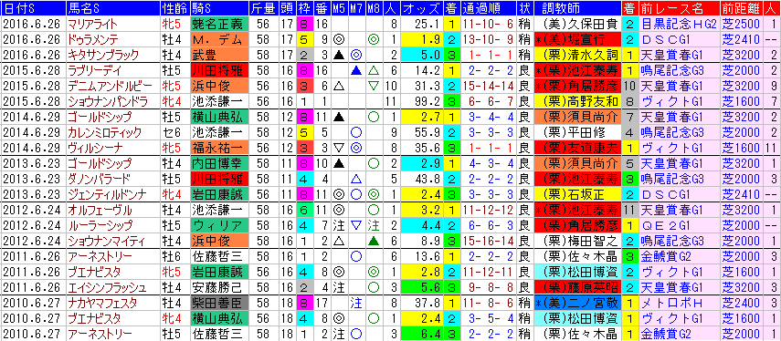 | 8 | ミッキークイーン | 浜 中 | 56 | 池江泰寿 | ヴィクトリアMG1 芝1600 | 7 | 66 | -0.5 | 0.0 | 06/07 | ノーザンFしがらき | |
