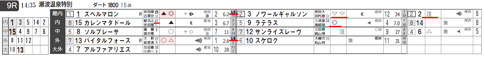 コンビニ版位置取りシート13・バイタルフォースは「外」1番手、IDM・展開Wで展開マーク「@」、前走レースレベル「S」での昇級初戦。