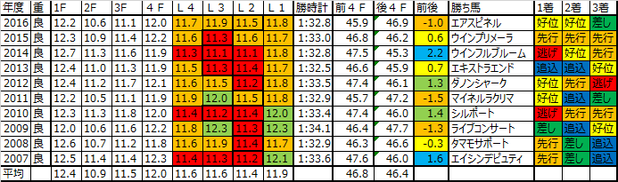 まずは全体のペースだが結構マチマチ。過去10年で平均とややハイが最多の3度、次点がかなりのスロー、ややスローの2度ずつ。かなりのハイまでは辛うじて達していないものの、結構流れることも多いしスローになることもあるので正直展開的には全く傾向が掴めない、というのが傾向。