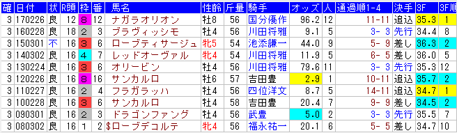 | 2017/2/26 | 良 | 12 | 7-8 | 7-7 | 11-11 | 33.8-35.9 | 01:21.4 |