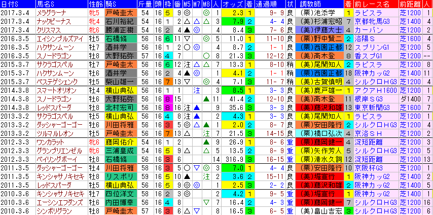 | ナックビーナス | 横山典 | 54 | 杉浦宏昭 | シルクロードSG3 芝1200 | 5 | 67 | -0.4 | 0.0 | / | |||
