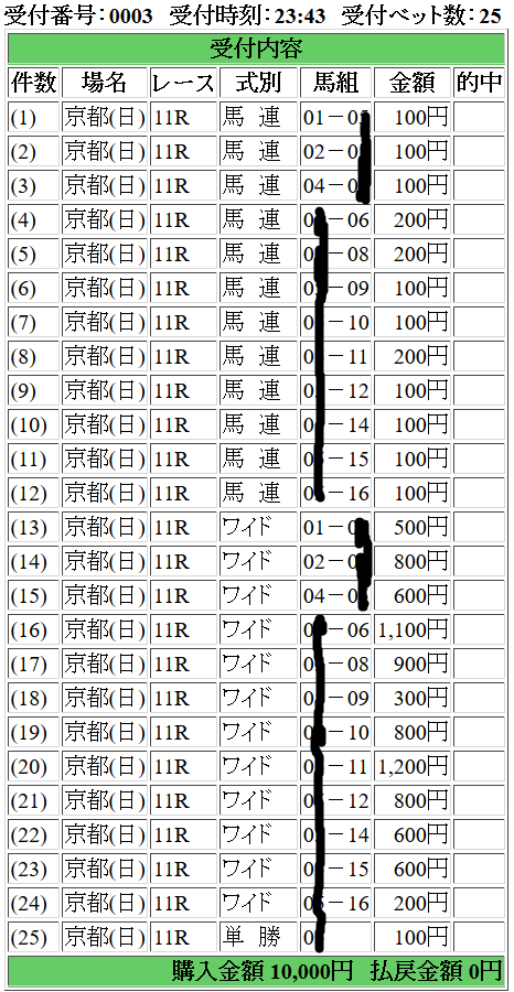 三連複は現実的ではありませんので、せめてワイドの方で…これまた期待値低い&個人的にも可能性0と見る超人気薄馬(14番人気以下)を除いた《ワイド同一払戻額配分◎→上位人気12頭流し》をベースとして、少しシュヴァルグラン厚めと、あとは馬連と単勝も細々購入します。