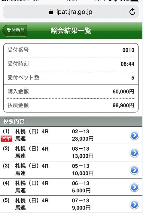 10万円コロガシ週の各レースの成績は46戦36勝となっています。