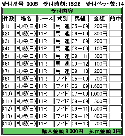 (ワイド1つ的中なら平均回収率754%・2つ的中なら1508%・馬連も的中なら2262%という払戻回収率になる基準買い目購入でした)