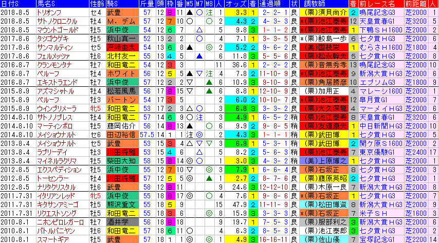 | タニノフランケル | 松若風 | 55 | 角居勝彦 | 七夕賞・G3 芝2000 | 6 | 61 | -0.2 | -0.8 | / | |||